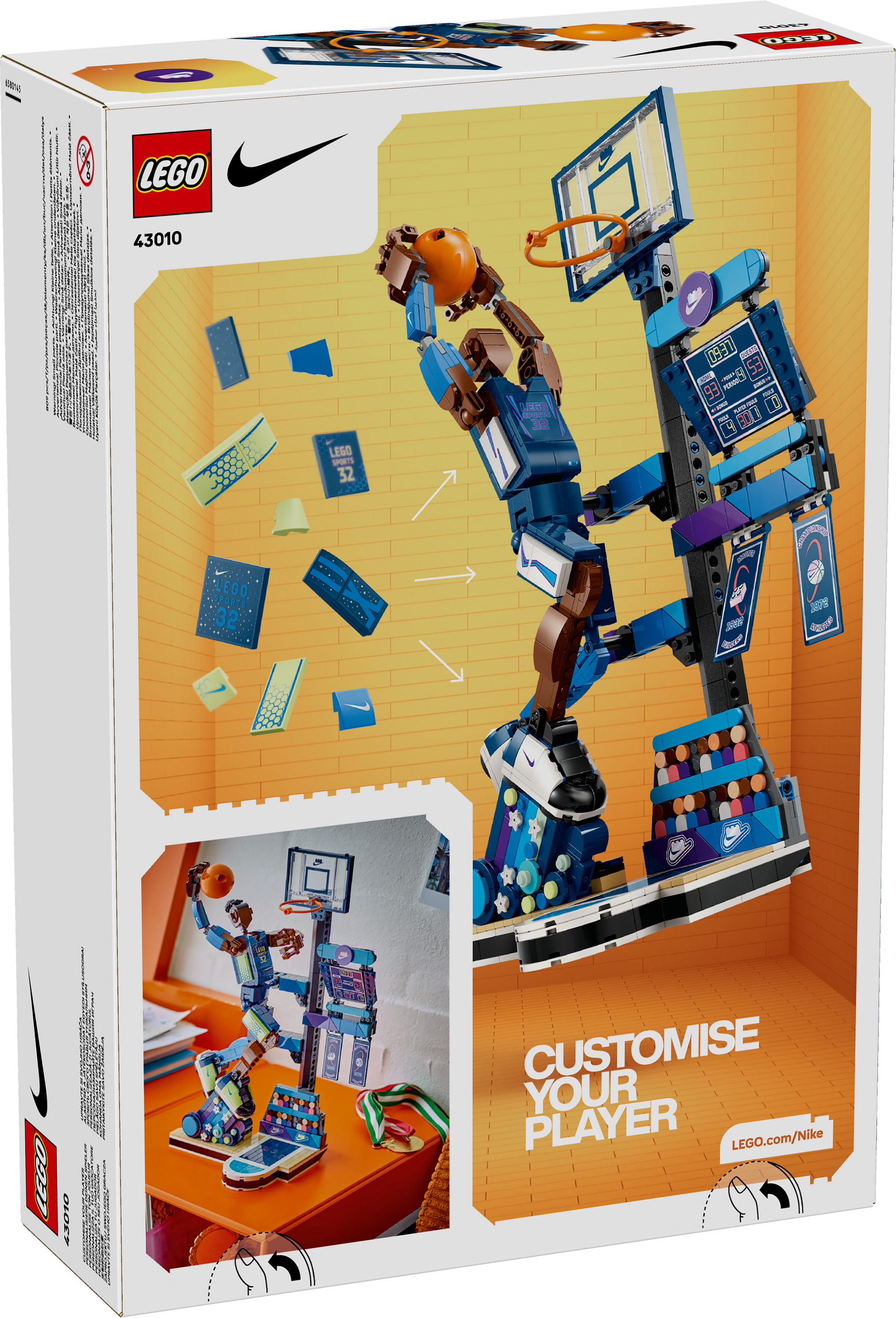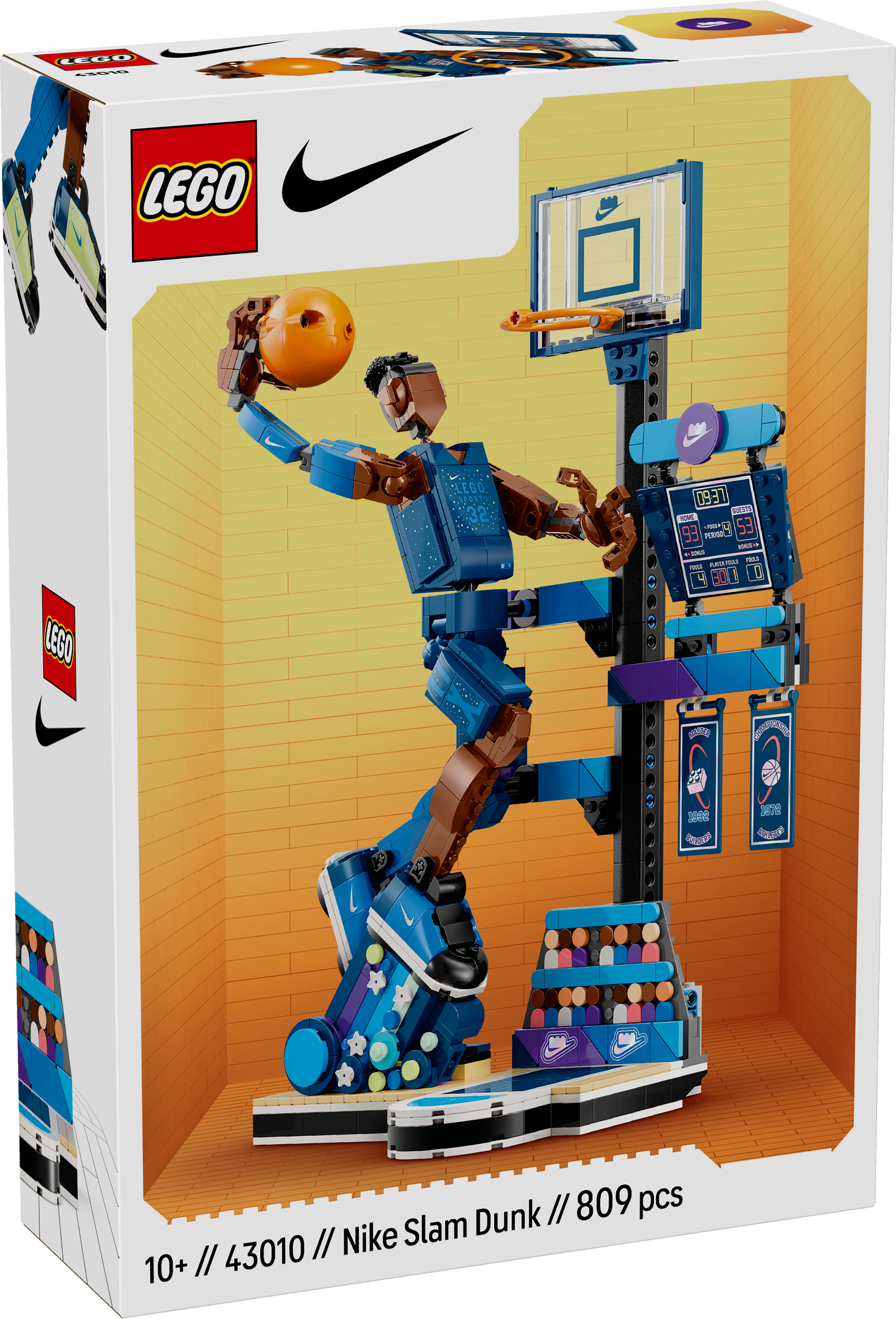 - Kids’ sports toy – A basketball hoop, scoreboard, championship banner and spectators complete the slam dunk scene and there are fun LEGO® and Nike Easter eggs for fans to discover