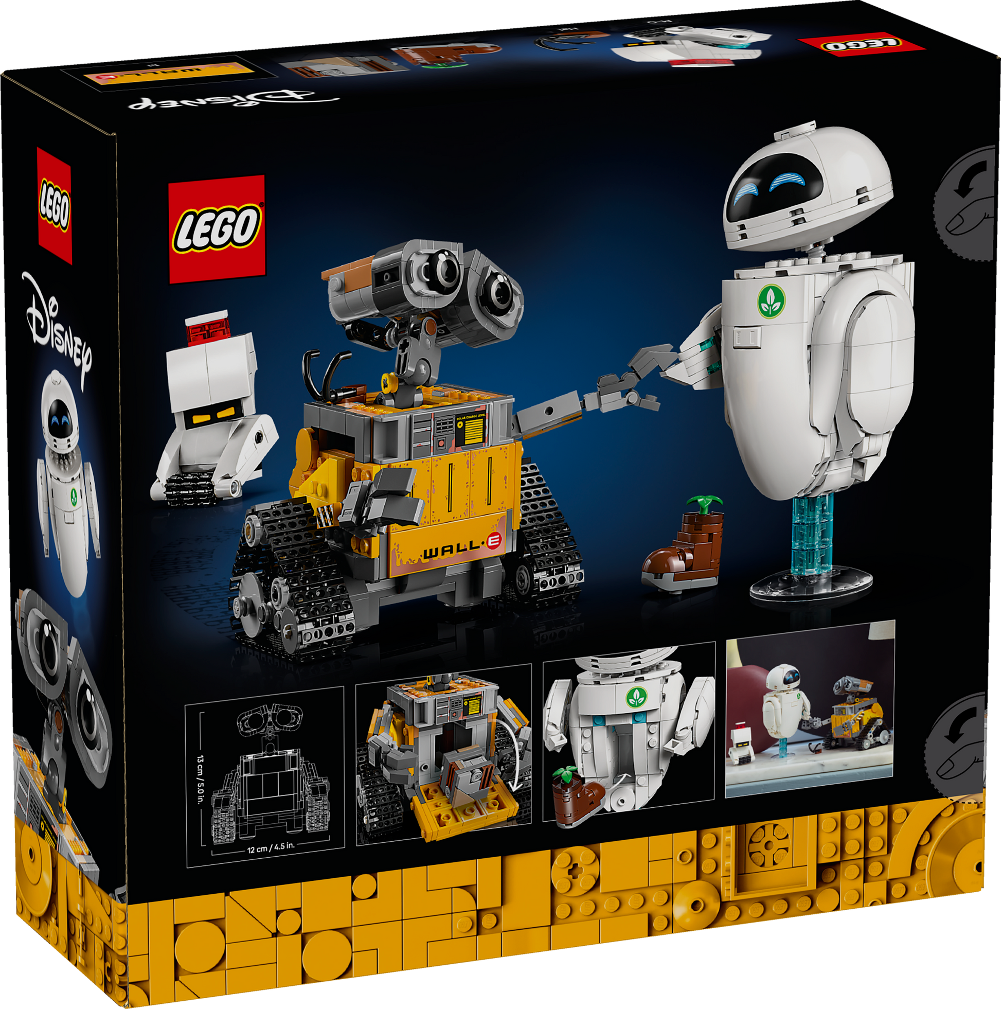 - Robot character dimensions – The Disney and Pixar WALL-E buildable model in this 811-piece LEGO® building kit for adults stands over 5 in. (13 cm) tall
