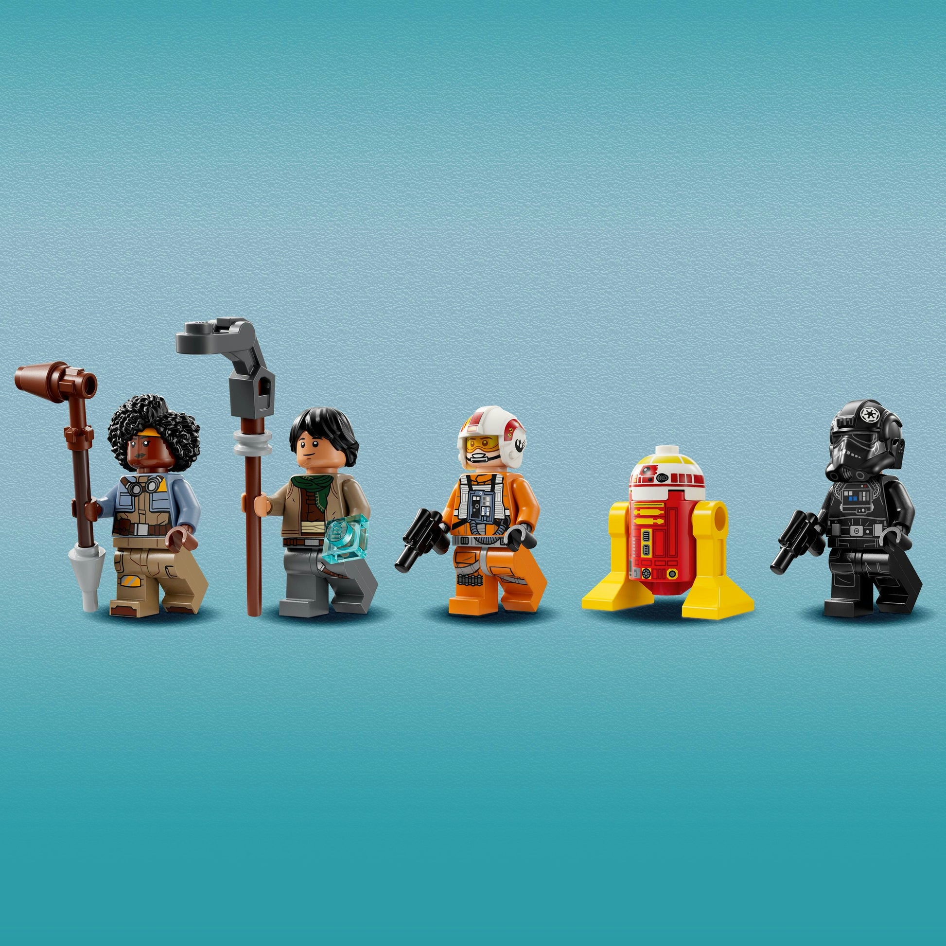 The buildable adventure playset also includes 4 LEGO Star Wars minifigures with accessories, plus an L3-G0 droid LEGO figure that fits behind the X-wing cockpit.