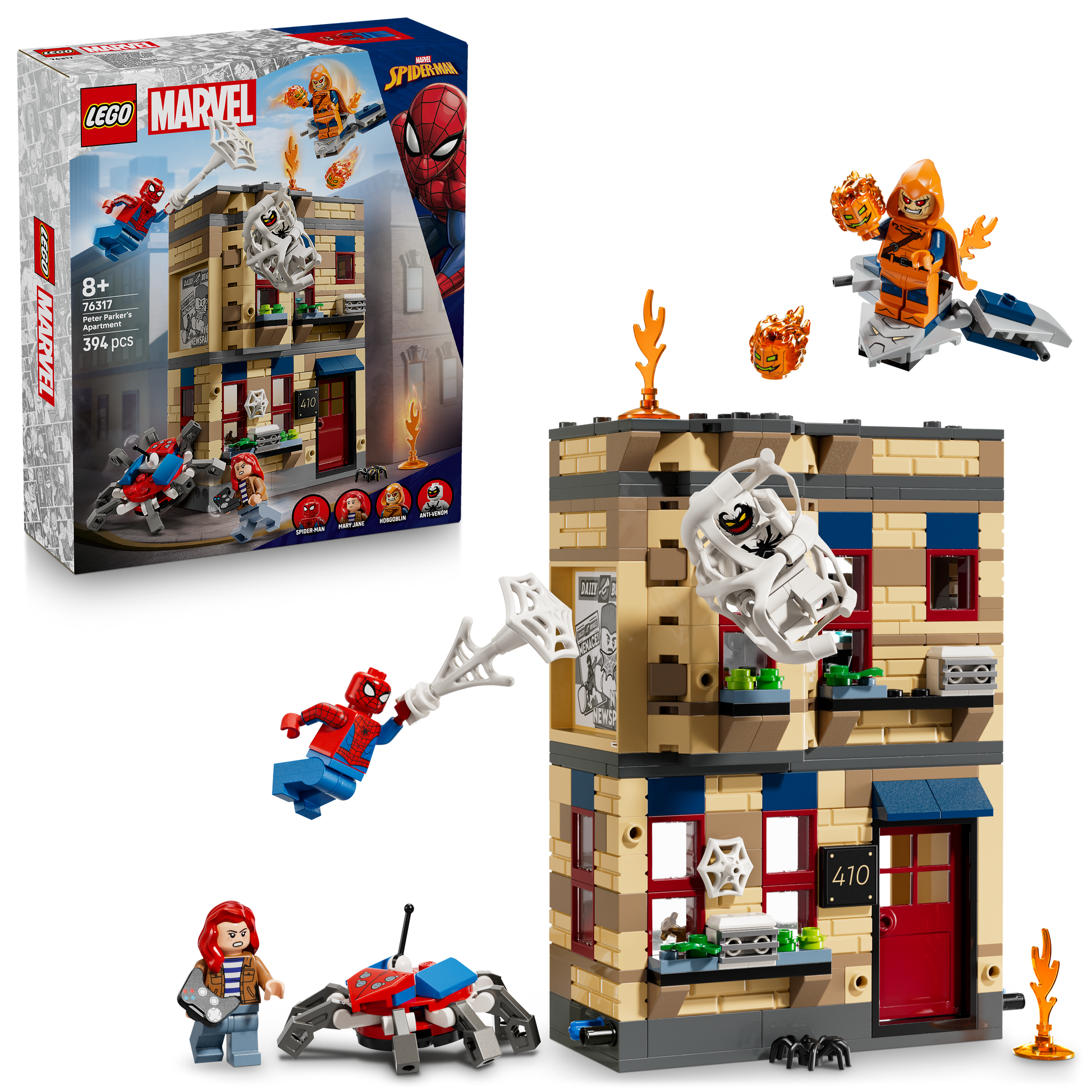 The buildable set contains 4 minifigures: Hobgoblin on his glider with pumpkin bombs; Spider-Man and Anti-Venom blasting webs; and Mary Jane with a jointed spider robot. A giant, flexible web attached to the building can trap a minifigure. On the apartment’s ground floor is a kitchen. The first floor has a study and bedroom containing a flip-up bed, desk, computer, camera and a microscope. A push-button function makes part of the building collapse. Kids can connect this build-and-play set to Spider-Man vs. Oscorp (76324) and stack it on top of Spider-Verse: Miles Morales vs. The Spot (76311) for an even bigger play experience. Contains 394 pieces.