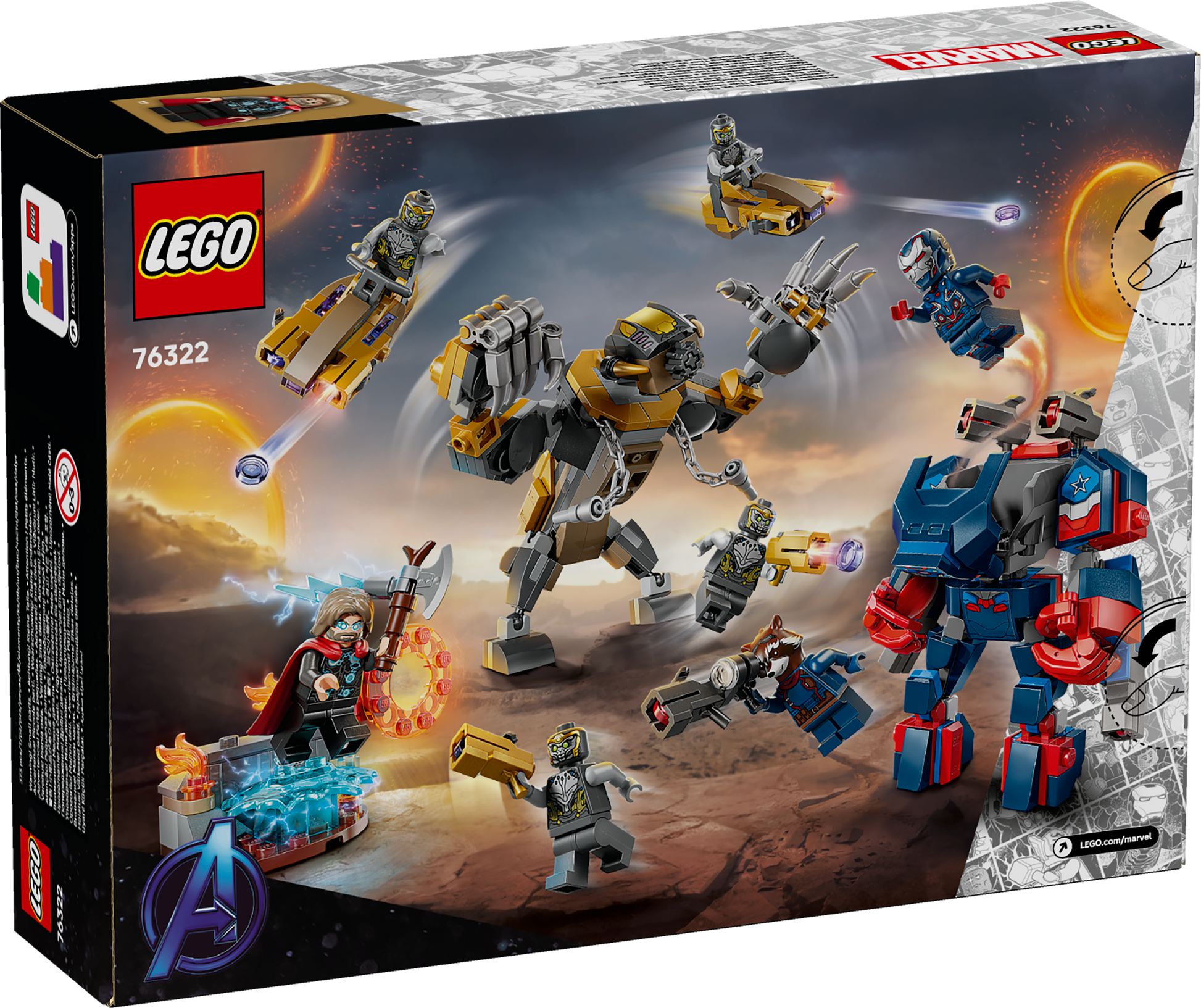 Based on an iconic Marvel Avengers film battle scene, this buildable Super Hero set includes 2 big LEGO figures: the Iron Patriot mech, which incorporates 4 stud shooters, and a fearsome Chitauri gorilla. Both are jointed for dynamic play. There are 7 minifigures: Iron Patriot MK2; Rocket with a large stud shooter; Thor with Stormbreaker; and 4 Chitauri, 2 of which have golden stud shooters. Other features include 2 jet scooters and a small environment for Thor, where spare shooter studs can be stored. This build-and-play set connects to Avengers: Endgame Final Battle (76323) for a larger play experience. Builders can also zoom in and rotate models in 3D using the fun, intuitive LEGO Builder app. Contains 373 pieces.