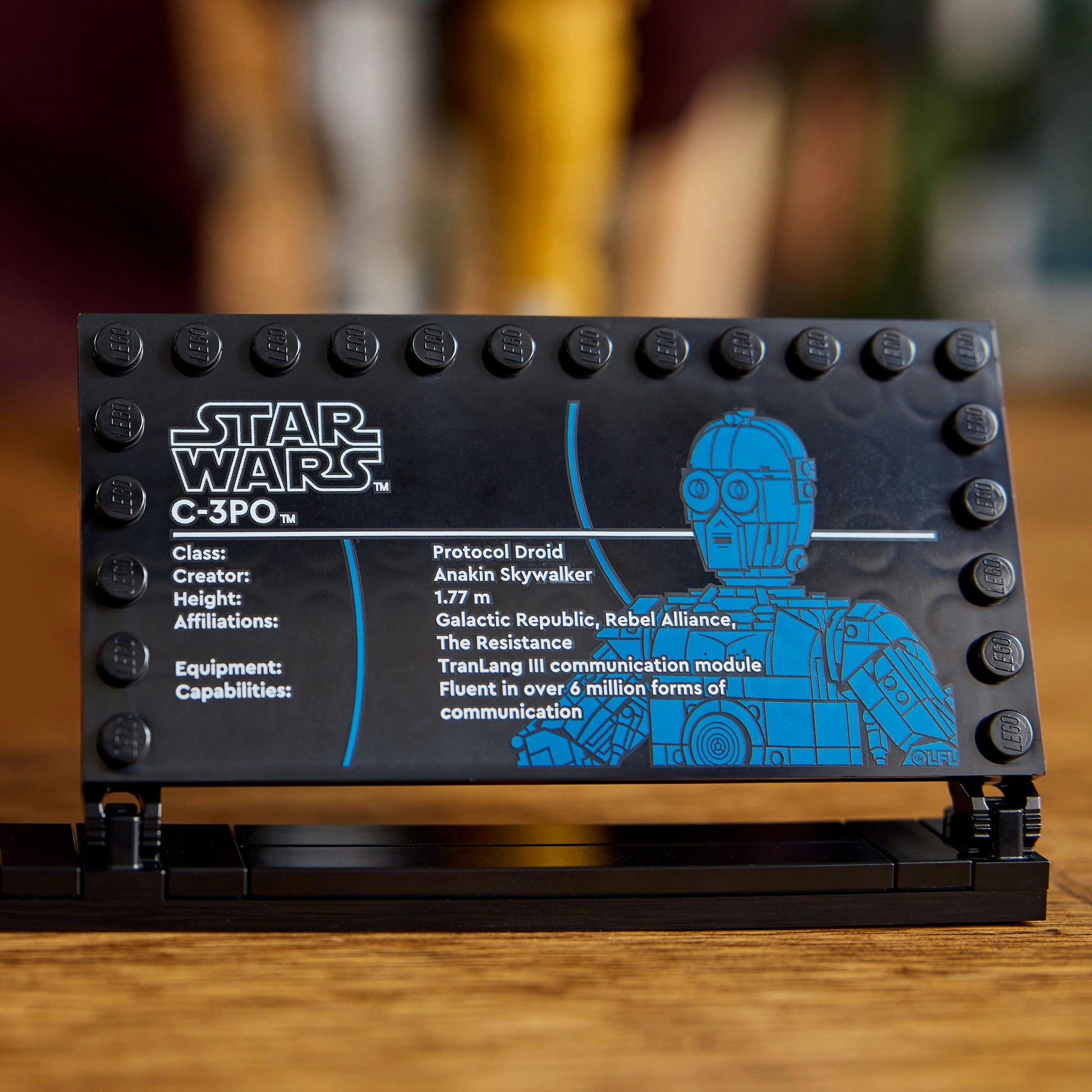 - 25th anniversary centrepiece – The set includes a stand with a C-3PO information plaque and space for the C-3PO LEGO® minifigure, plus a LEGO Star Wars™ 25th anniversary brick