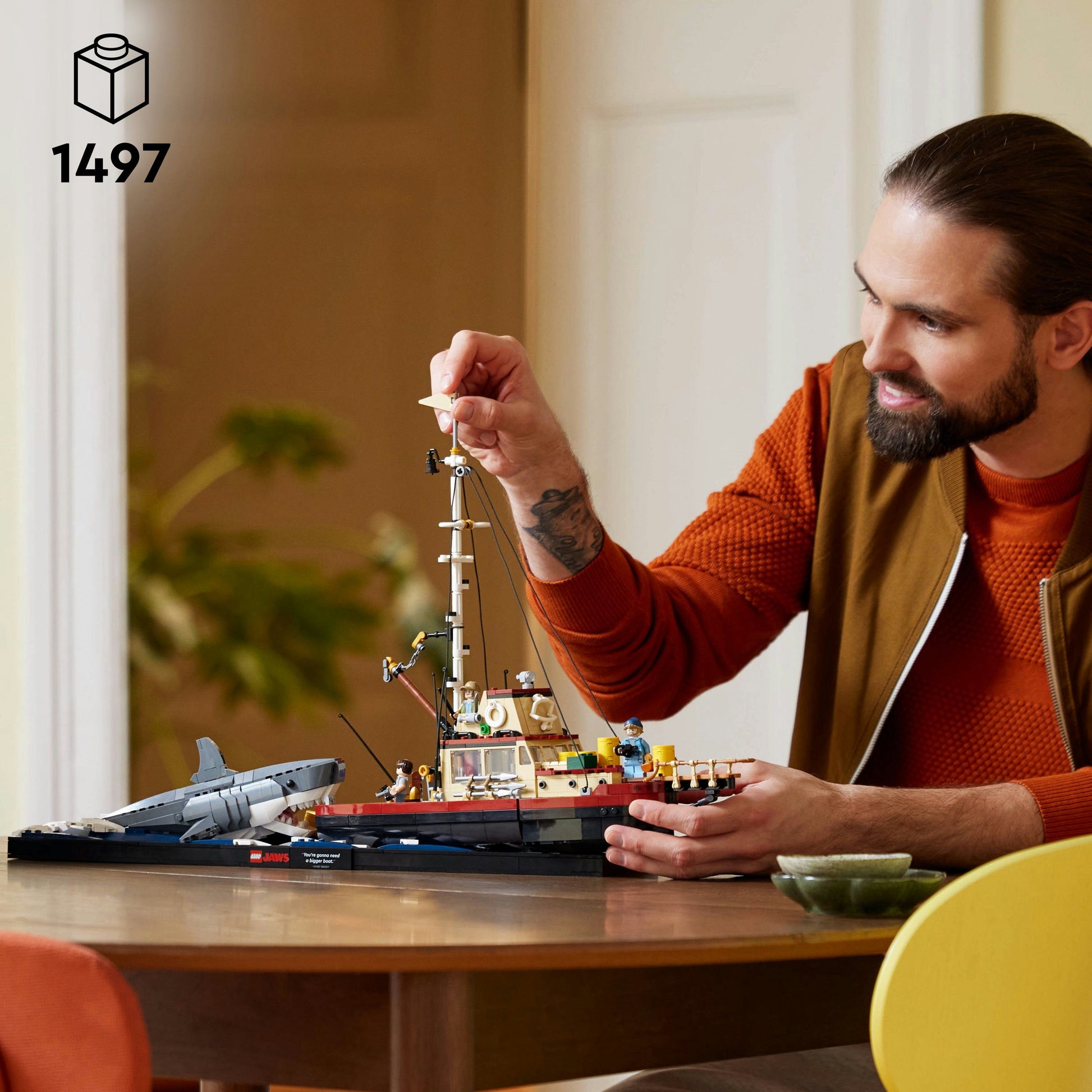 - Playful decor for the home – The Orca boat model in this 1,497-piece Jaws LEGO® set measures over 35 cm (14 in.) high, 59 cm (23 in.) long and 20 cm (7.5 in.) wide