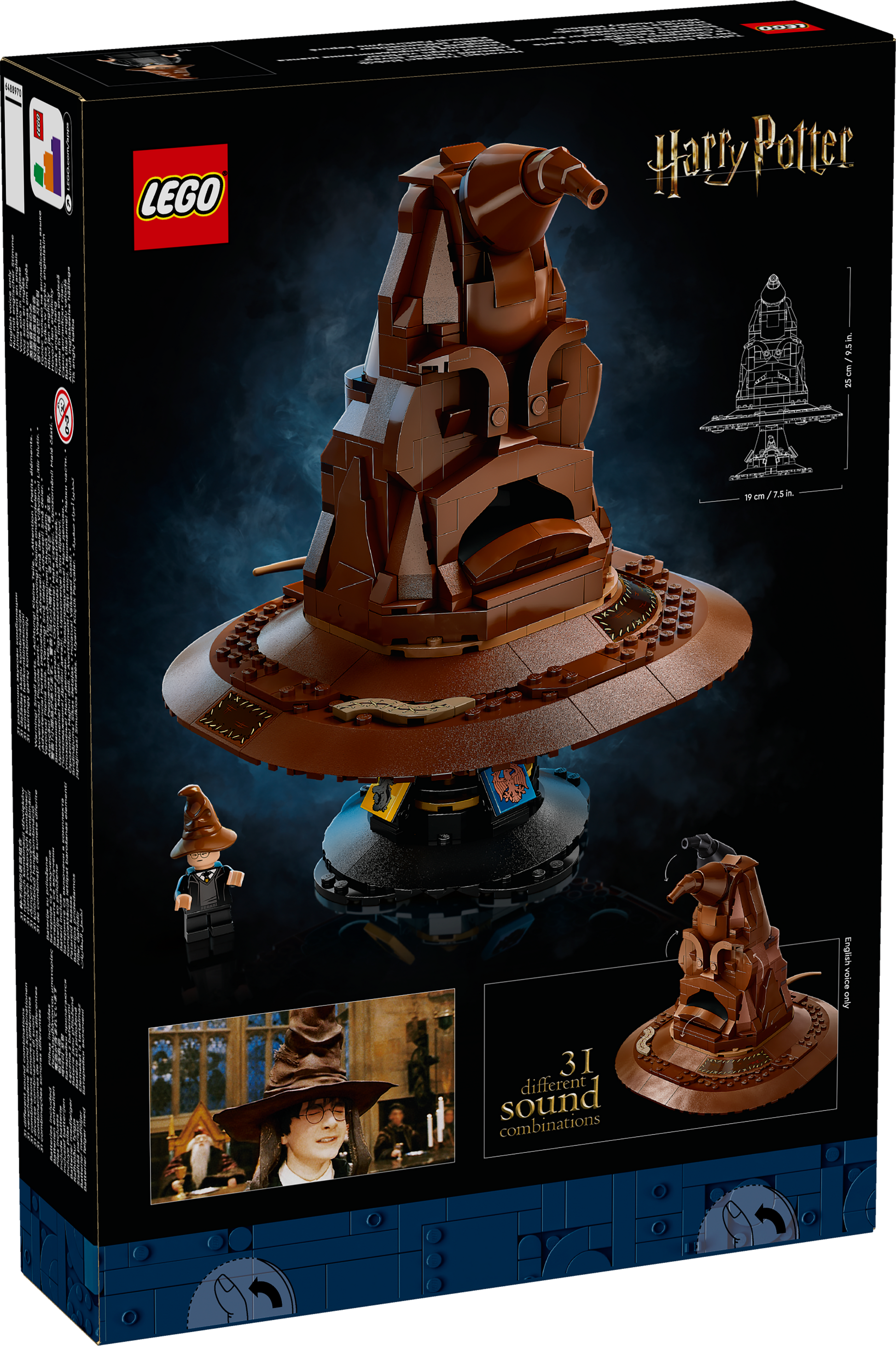Der Sprechende Hut (76429) von Schloss Hogwarts ist das allererste LEGO Harry Potter Set mit einem Geräuschstein. Sieh zu, wie er dieses Modell zum Leben erweckt. Tippe oben auf den Hogwarts-Hut oder setz ihn dir auf, um die Stimme des Sprechenden Huts zu aktivieren. Dann erfährst du, welches Hogwarts Haus er für dich auswählt. Ab und zu ist sogar das Lied des Sprechenden Huts zu hören. Stell den Harry Potter Hut auf den Ständer, der mit den Wappen der Häuser Gryffindor, Slytherin, Hufflepuff und Ravenclaw verziert ist. Die Minifigur Harry Potter mit eigenem Sprechenden Hut auf dem Kopf macht dieses einzigartige LEGO Set zu einem ganz besonderen Ausstellungsstück. Dieses LEGO Set für Erwachsene zur spannenden Fantasy-Filmreihe ist eine magische Belohnung für dich selbst, ein tolles Geschenk für Mama und Papa, die die Zauberwelt lieben, und das beste Harry Potter Geschenk für andere erwachsene Frauen und Männer, die Fans der Harry Potter Filme sind.