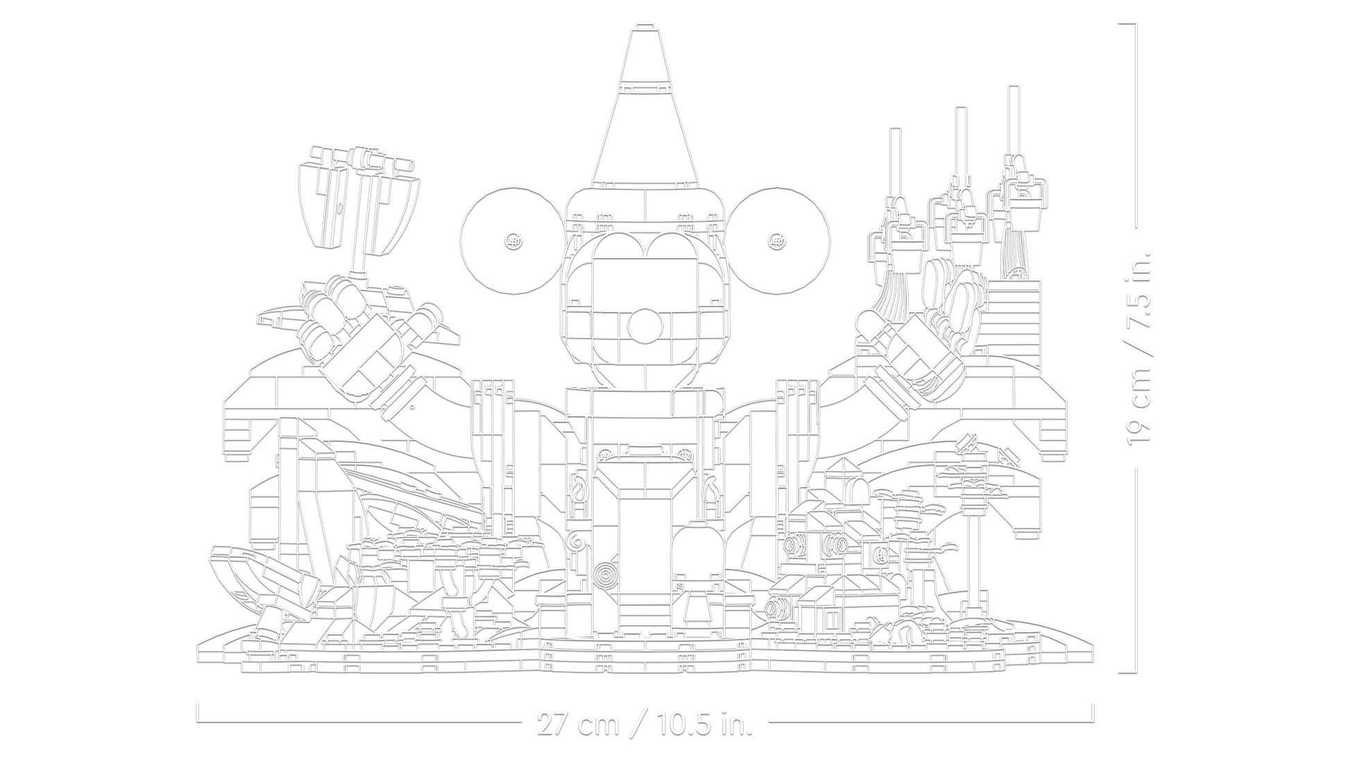 - Dimensions – This 1,103-piece LEGO® brick-built Disney model measures over 19 cm (7.5 in.) high, 27 cm (10.5 in.) wide and 17 cm (6.5 in.) deep