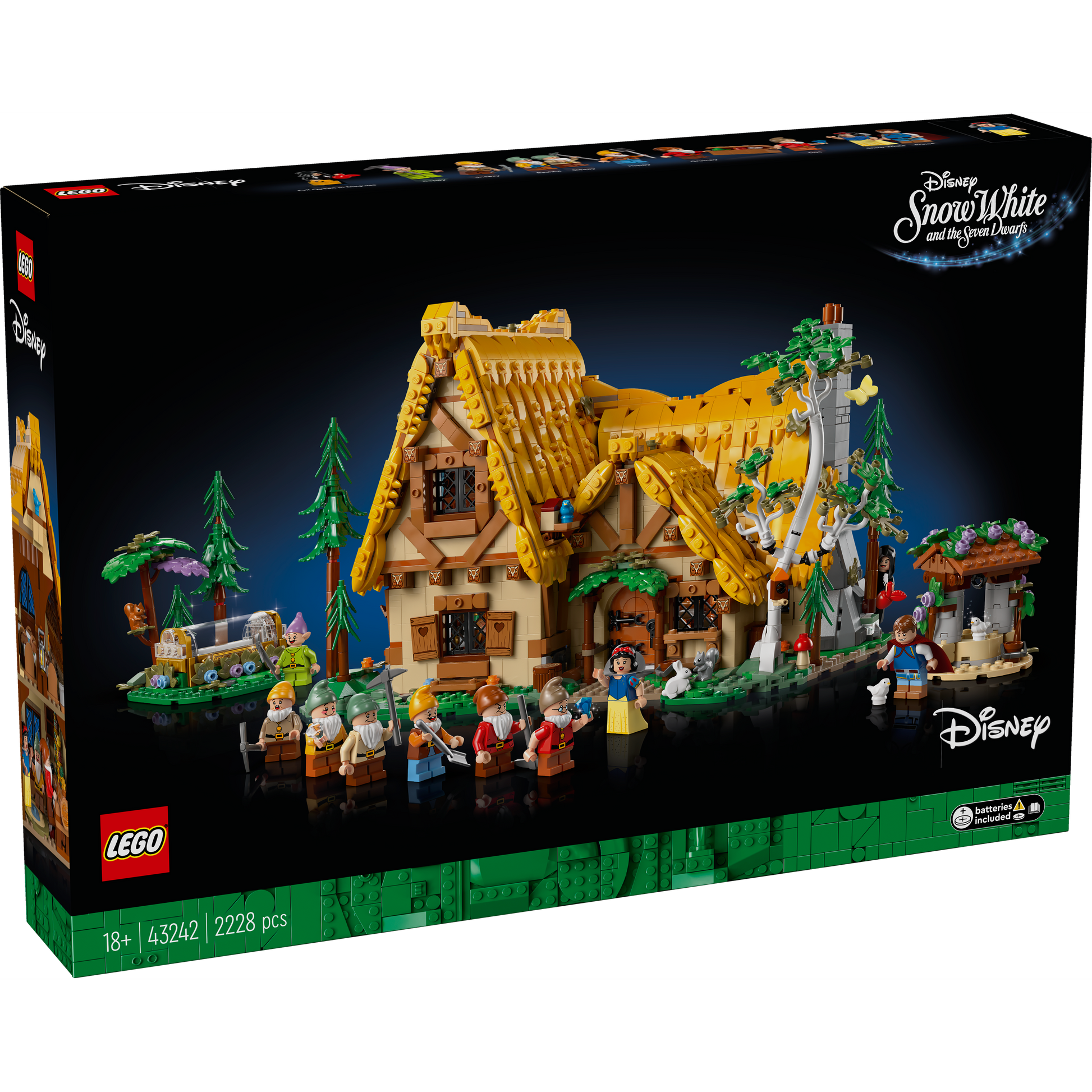 Share your passion for a classic Disney film with this detailed LEGO® ǀ Disney Snow White and the Seven Dwarfs’ Cottage (43242) display model. The collectible building kit for adults features an opening cottage with sleeping, dining and music areas, plus a kitchen with a light brick (batteries for the light brick are included) in the hearth to add a glow. One side of the roof can also be removed for easier access, and there’s a small buildable wishing well and forest scene with a glass coffin. The set includes 10 well-known Snow White and the Seven Dwarfs characters: Snow White, the Evil Queen in Disguise, the Prince, Doc, Dopey, Bashful, Grumpy, Happy, Sleepy and Sneezy, plus 6 LEGO ǀ Disney animal figures.